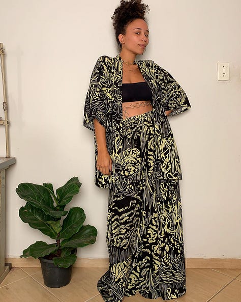 E tem a Jade Xavier, de Piracicaba, no interior paulista, da qual sou cliente há anos. Assim como a Urban Flowers, Jade não trabalha com estoque para não gerar desperdício. Você escolhe entre o modelo e a estampa disponíveis, e Jade faz a peça para você. As modelagens são pensadas para evitar resíduo têxtil, assim como as embalagens reaproveitam retalhos de tecido (mais: funcionam como proteção da peça na máquina de lavar). A produção é artesanal, 100% feminina.